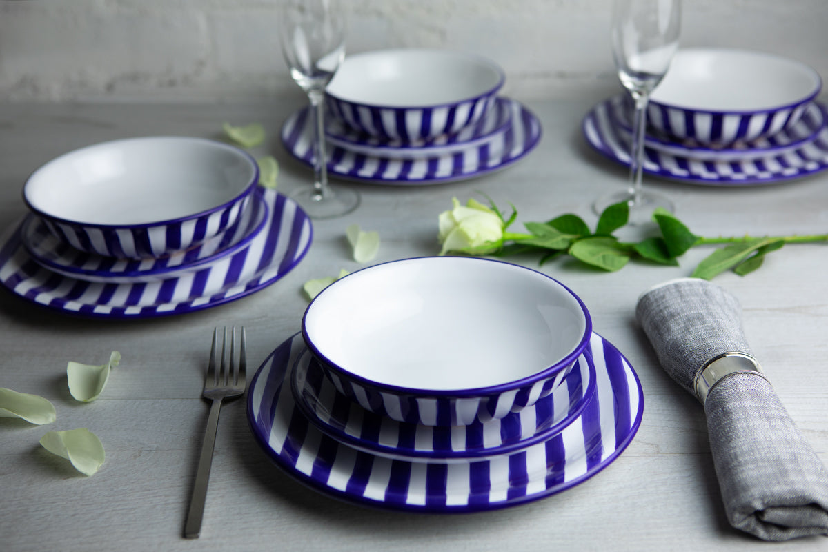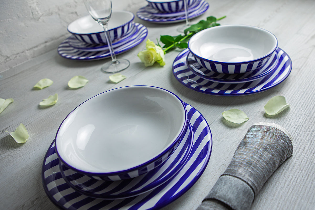 - Our dark navy blue striped handmade hand painted ceramic 12 piece tableware set, dinnerware service for 4, crockery sets are hand painted dish sets, but still dishwasher safe - less time washing up, more time having fun.