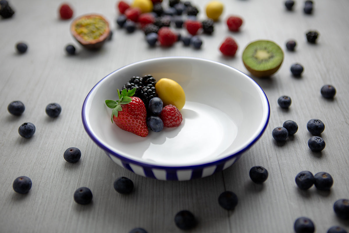 - All surfaces that come into direct contact with food or drink on all dark navy blue striped handmade hand painted ceramic 12 piece tableware set, dinnerware service for 4, crockery sets we sell have smooth, unbroken glossy surfaces, without cracks, rough spots of texturing that water, juices or oils could penetrate.