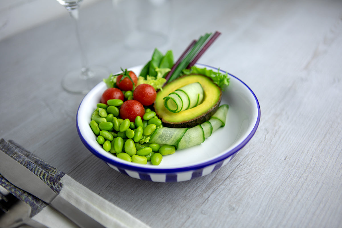 - 4 dark navy blue striped handmade hand painted ceramic salad, pasta, fruit, cereal, SOUP BOW