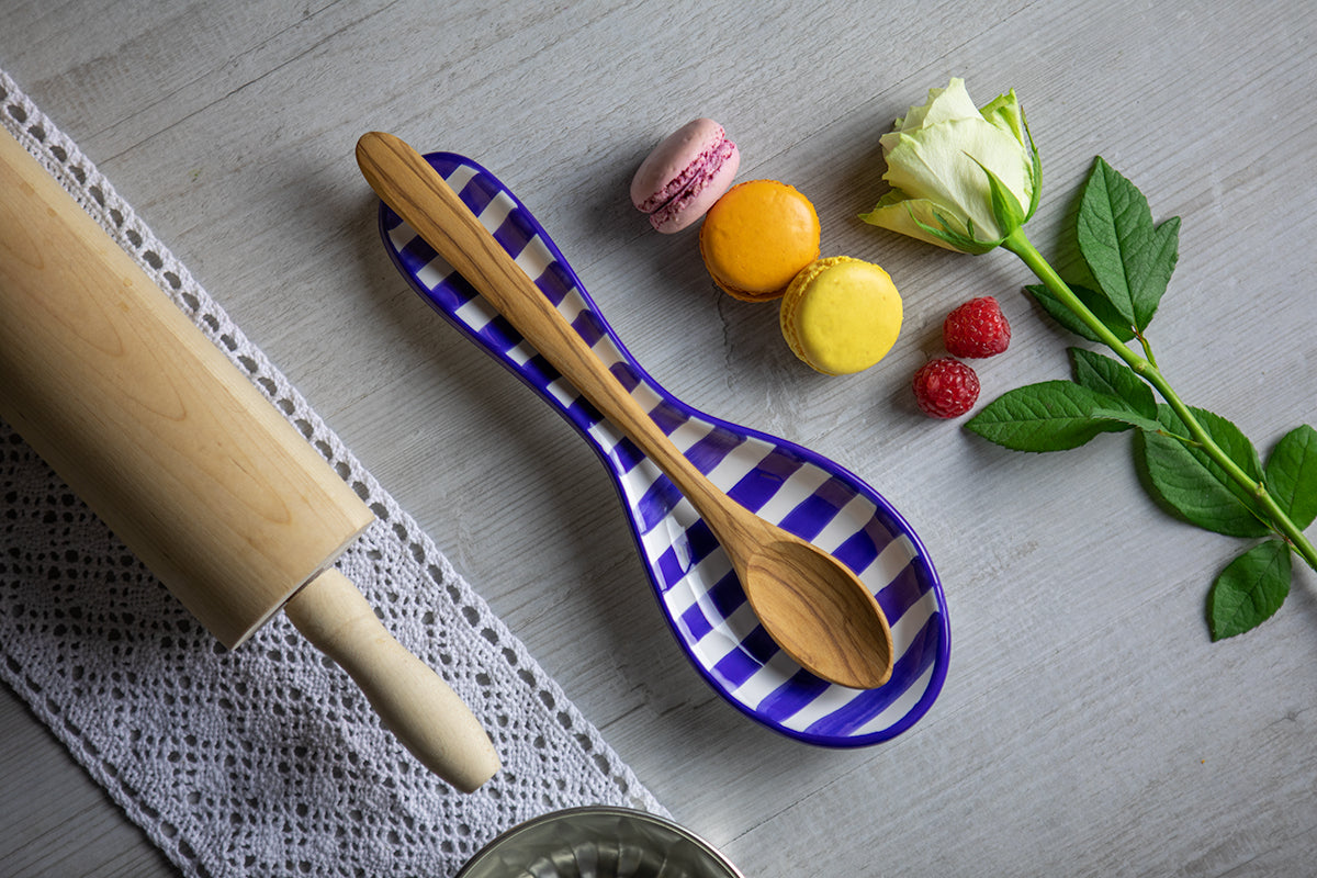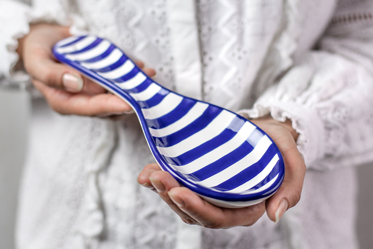 - We created this dark navy blue striped handmade hand painted ceramic pottery kitchen cooking spoon rest utensil holder that feels luxurious yet wallet-friendly at the same time.
