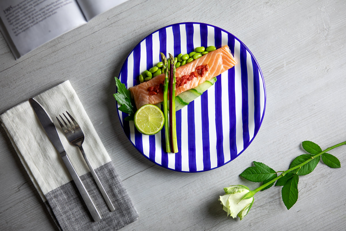 Pair these dark navy blue striped handmade hand painted glazed ceramic flat dinner plates with our bowls to introduce a touch of glamour into a casual Sunday roast or style it up with your favourite, monochrome napkins for an al fresco evening.