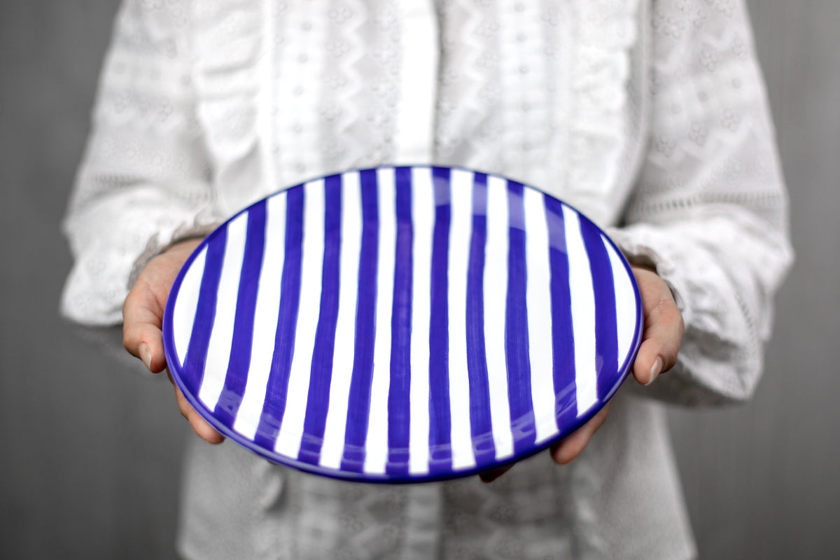 - Our dark navy blue striped handmade hand painted glazed ceramic flat dinner plates are hand painted striped kitchen accessories, but still dishwasher safe - less time washing up, more time having fun.