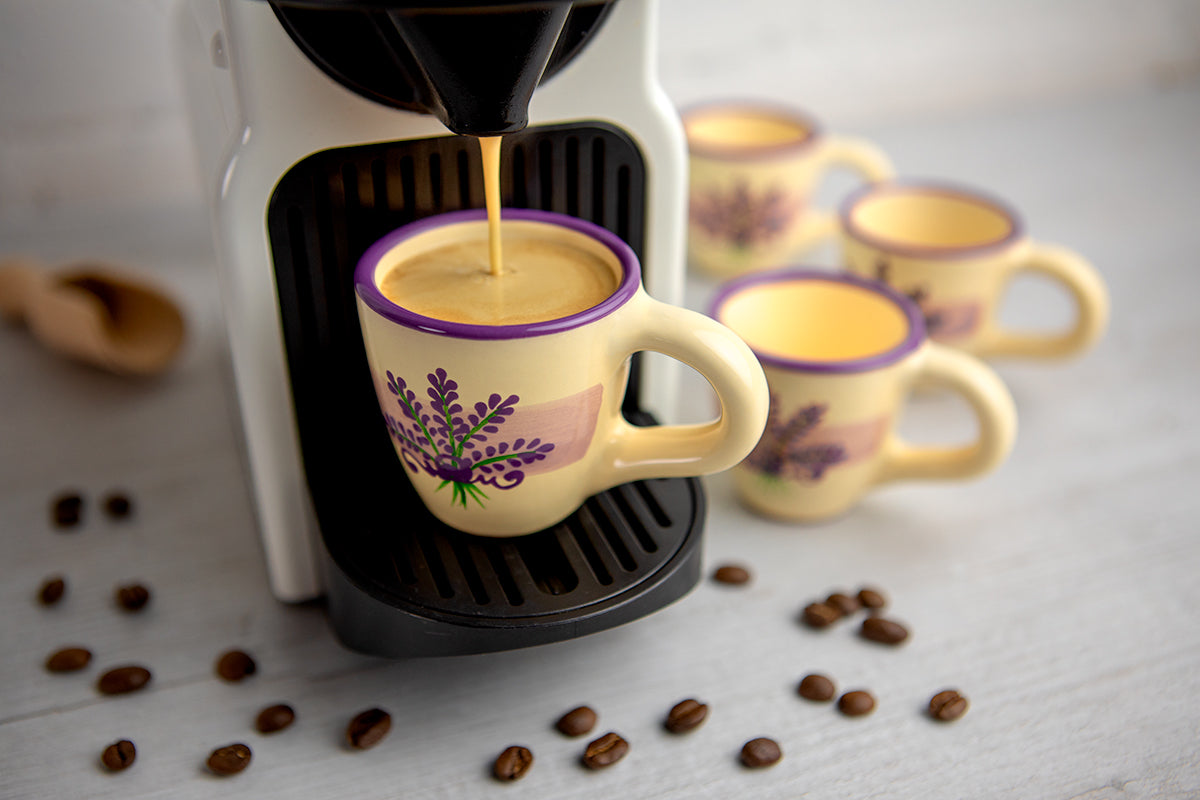 - Our lavender pattern purple and cream designer handmade hand painted unique ceramic espresso coffee cup set of 4 are made using solar power, so by choosing these ceramic eco espresso cups, you will help the environment, make your home eco-friendly and support sustainable living.