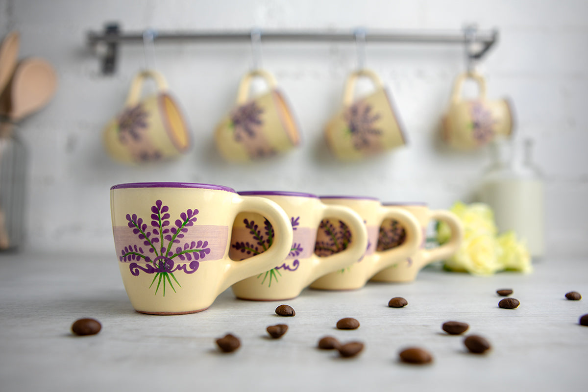 - We created this lavender pattern purple and cream designer handmade hand painted unique ceramic espresso coffee cup set of 4 that feel luxurious yet wallet-friendly at the same time.