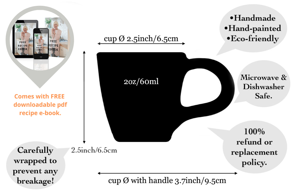 - All surfaces that come into direct contact with food or drink on all lavender pattern purple and cream designer handmade hand painted unique ceramic espresso coffee cups set of 4 we sell have smooth, unbroken glossy surfaces, without cracks, rough spots of texturing that water, juices or oils could penetrate.