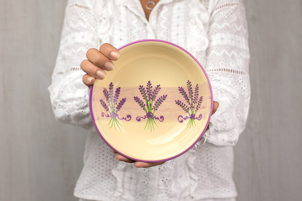 - Our lavender pattern purple and cream handmade hand painted ceramic dinnerware family, like our, lavender pattern purple and cream handmade hand painted ceramic salad, pasta, fruit, cereal, soup bowls, are unique gifts for all tastes, budgets and especially perfect gifts for your friends, colleagues and family members.