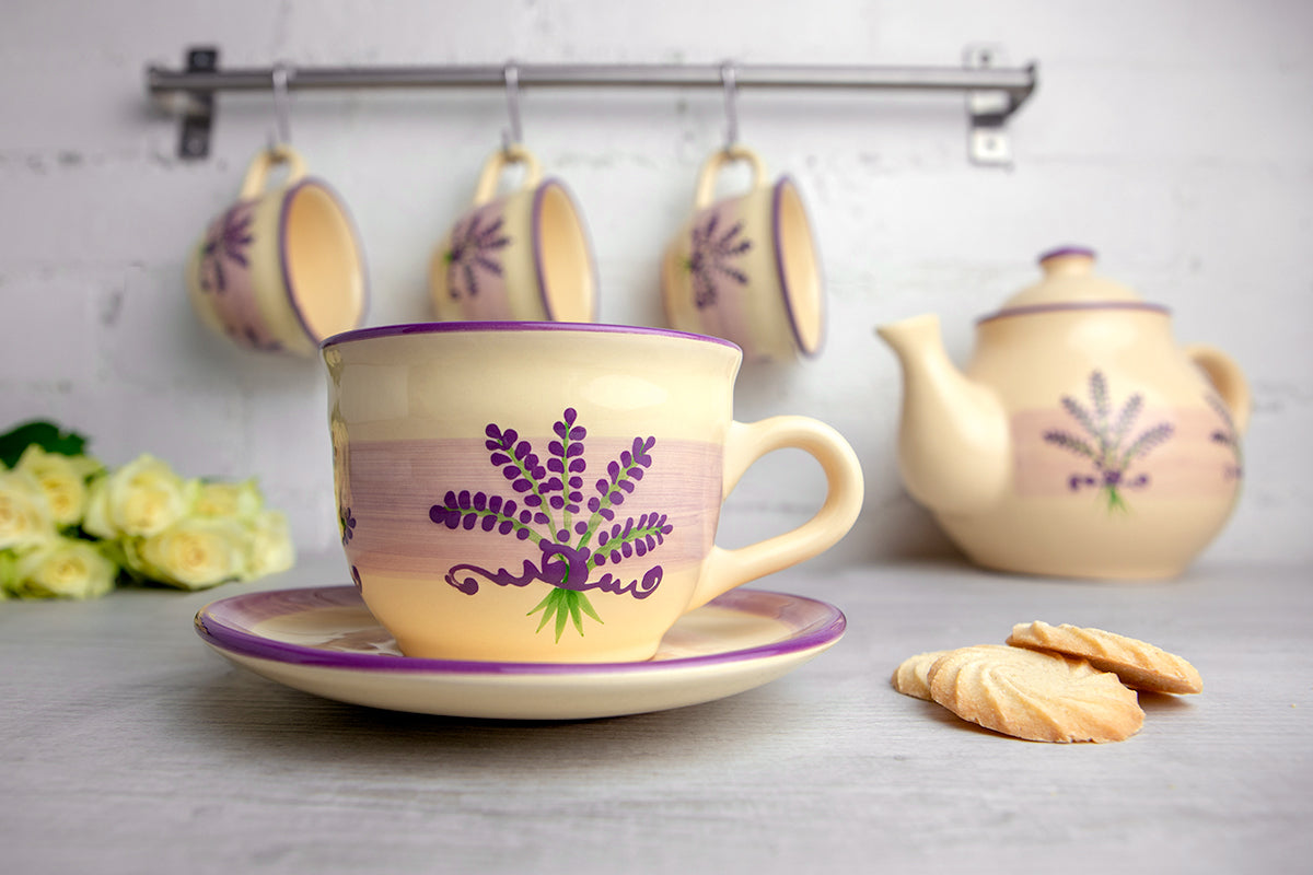 - We created this lavender pattern purple and cream handmade hand painted large unique ceramic cappuccino coffee tea cup with saucer that feel luxurious yet wallet-friendly at the same time.