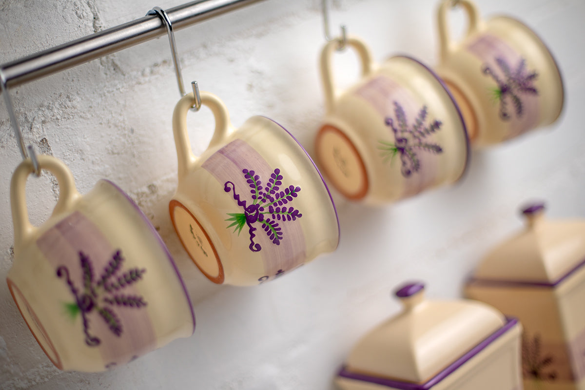 - Our lavender pattern purple and cream handmade hand painted large unique ceramic cappuccino coffee tea cups with saucer are hand painted lavender pattern coffee mugs, but still dishwasher safe - less time washing up, more time having fun.