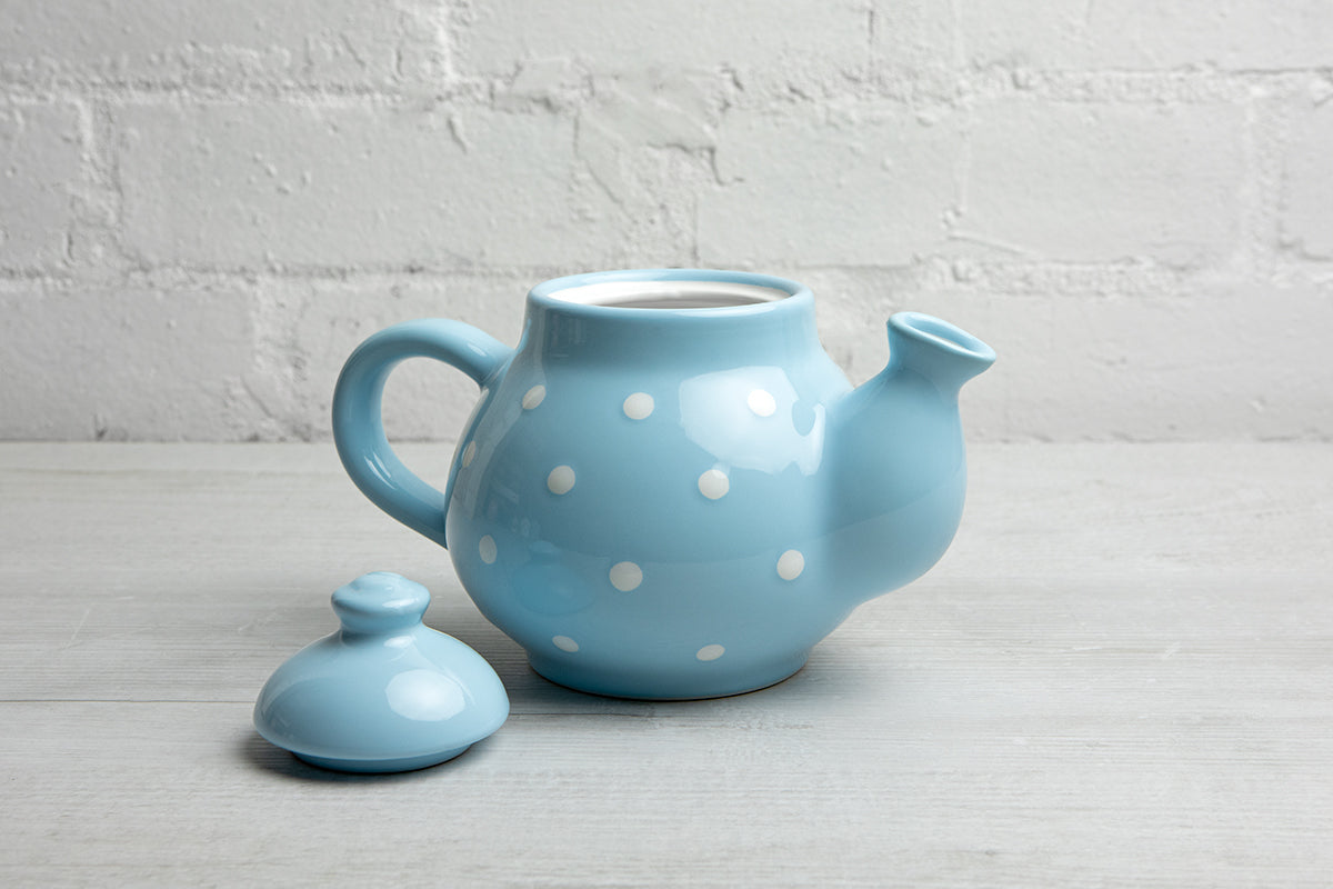 - Our light sky blue and white polka dot spotty handmade hand painted ceramic teapots with handle and lid are hand painted polka dot, spotty kitchen accessories, but still dishwasher safe - less time washing up, more time having fun.