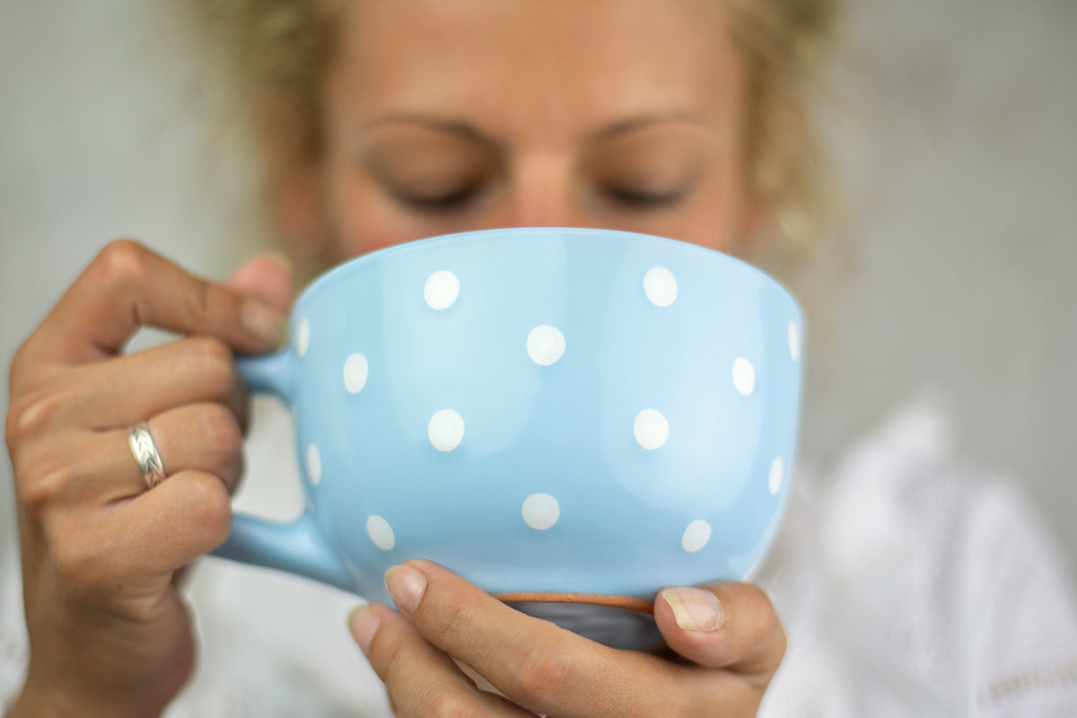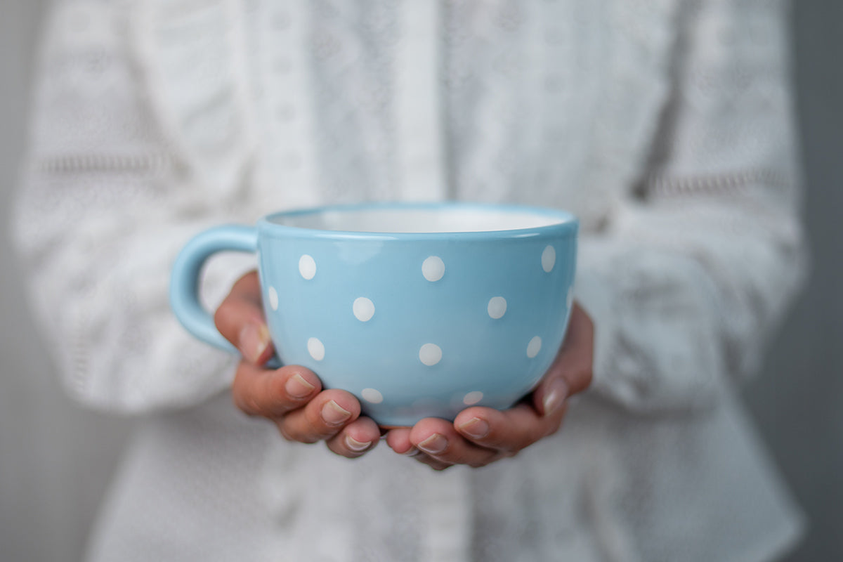 - Our light sky blue and white polka dot spotty handmade hand painted ceramic extra large cappuccino coffee tea soup mugs, cups are hand painted coffee mugs, but still dishwasher safe - less time washing up, more time having fun.