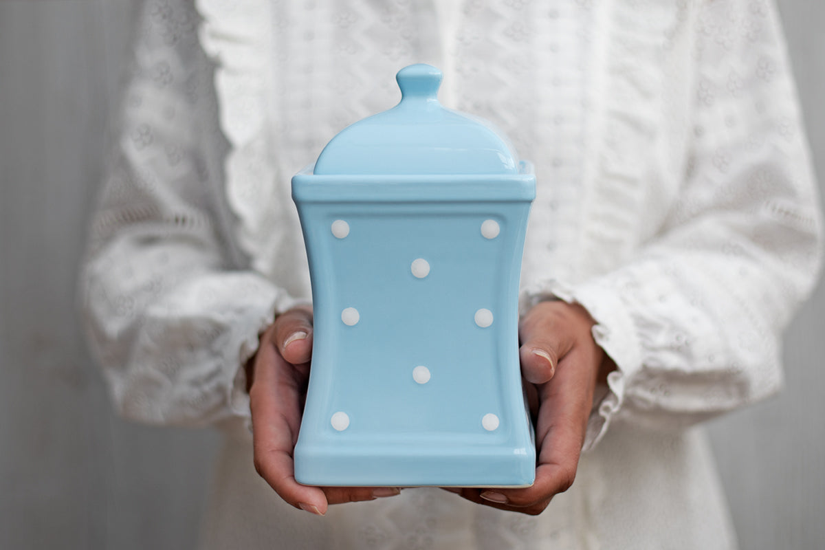 - We created this light sky blue and white polka dot spotty handmade hand painted ceramic kitchen serving storage set that feel luxurious yet wallet-friendly at the same time.