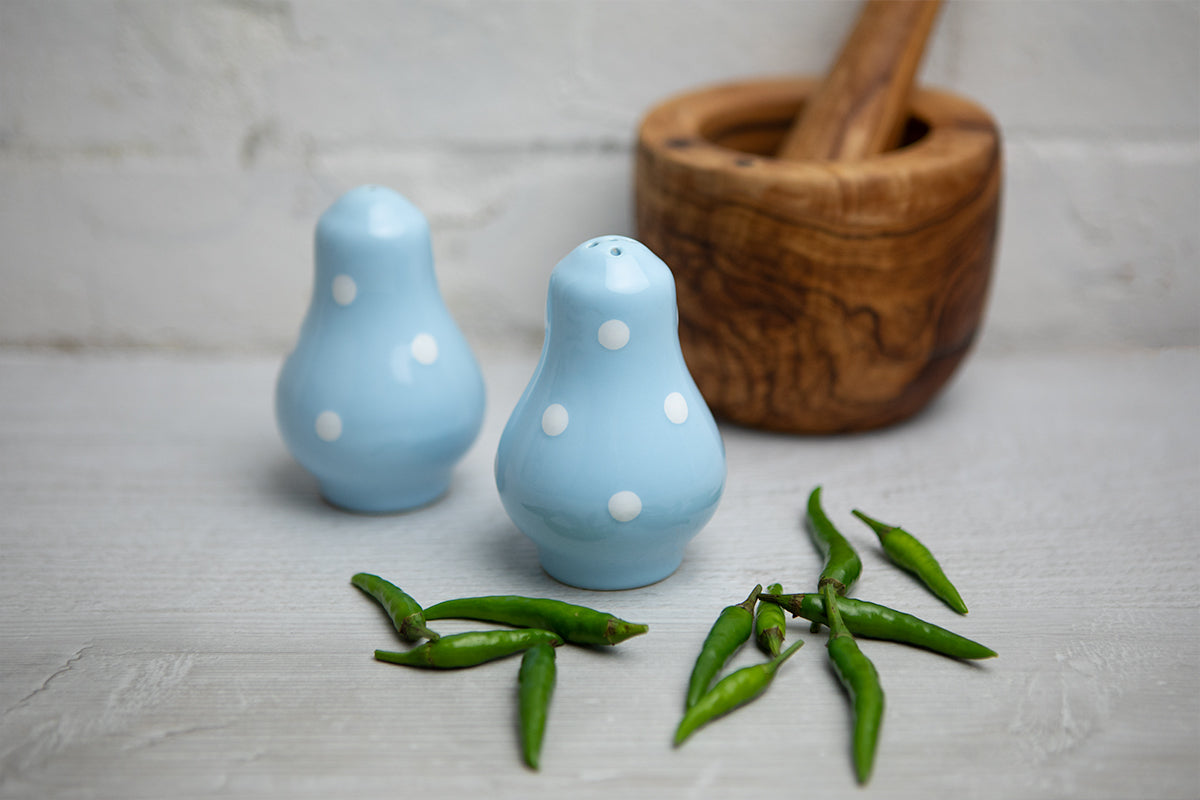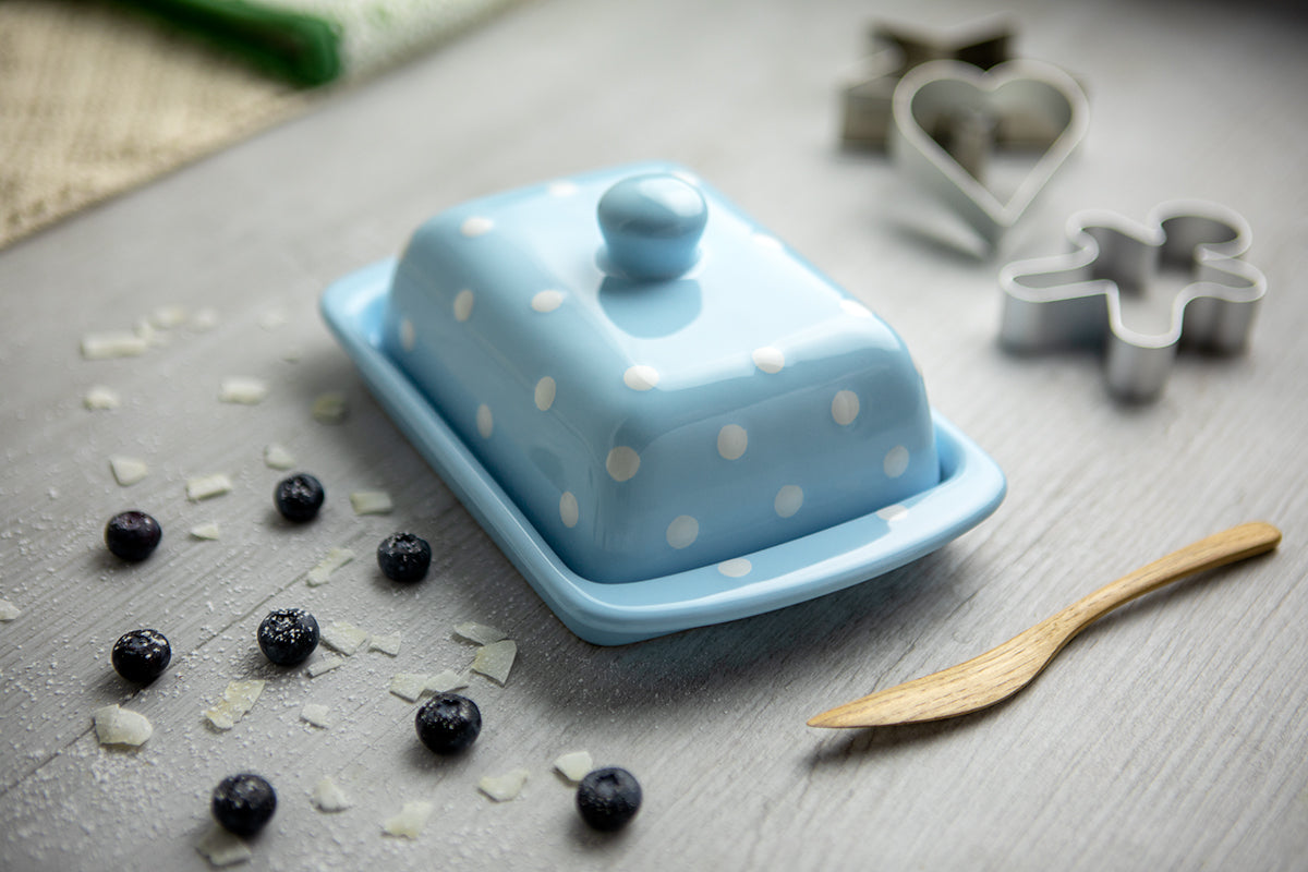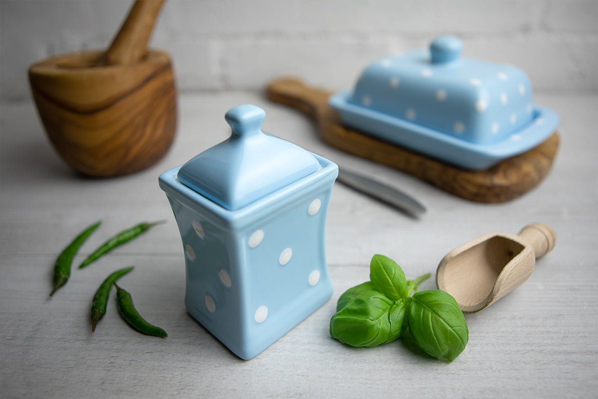 - Our light sky blue and white polka dot spotty handmade hand painted ceramic kitchen serving storage set have colourful, quirky design.