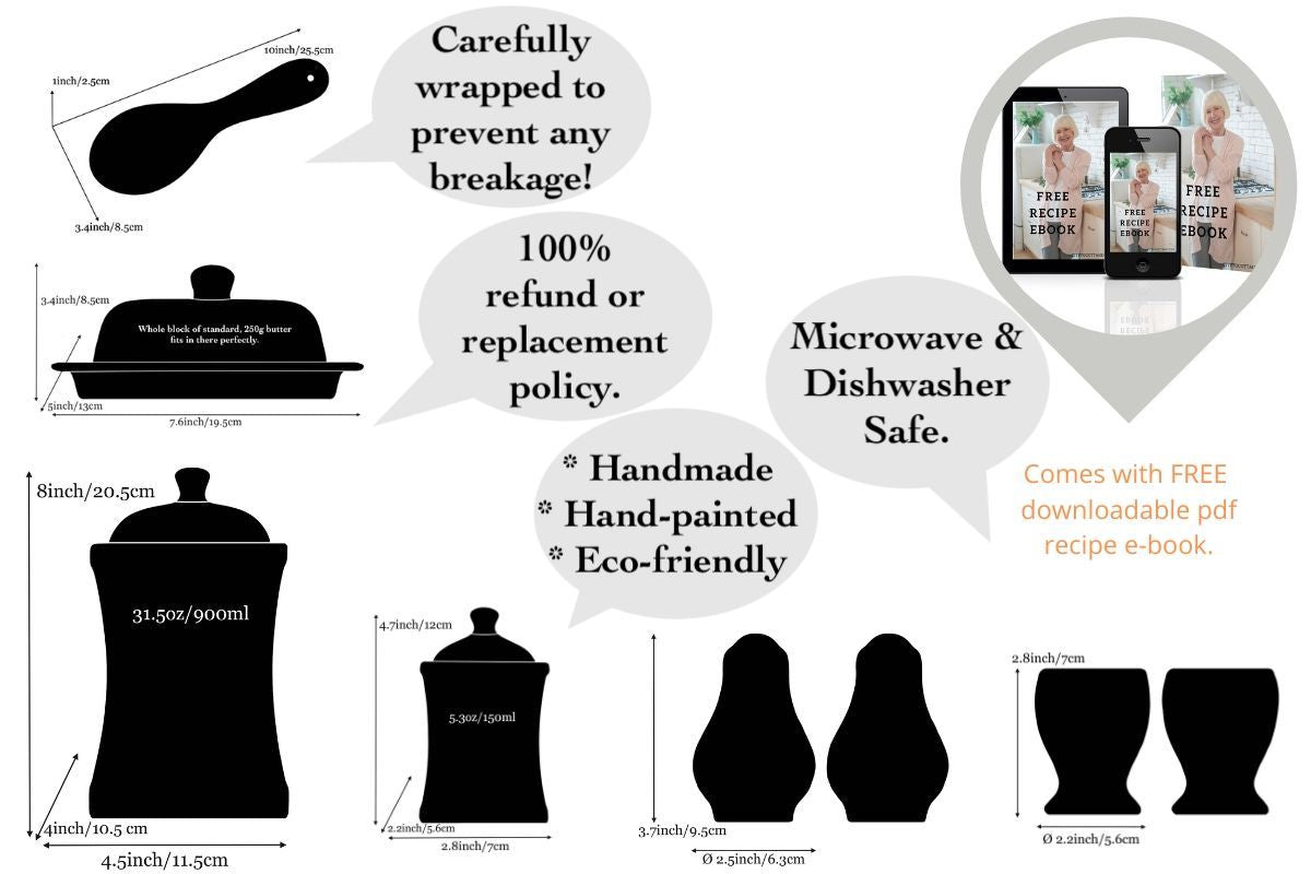 - Our light sky blue and white polka dot spotty handmade hand painted ceramic kitchen serving storage sets are made using solar power, so by choosing these ceramic eco kitchenware sets, you will help the environment, make your home eco-friendly and support sustainable living.