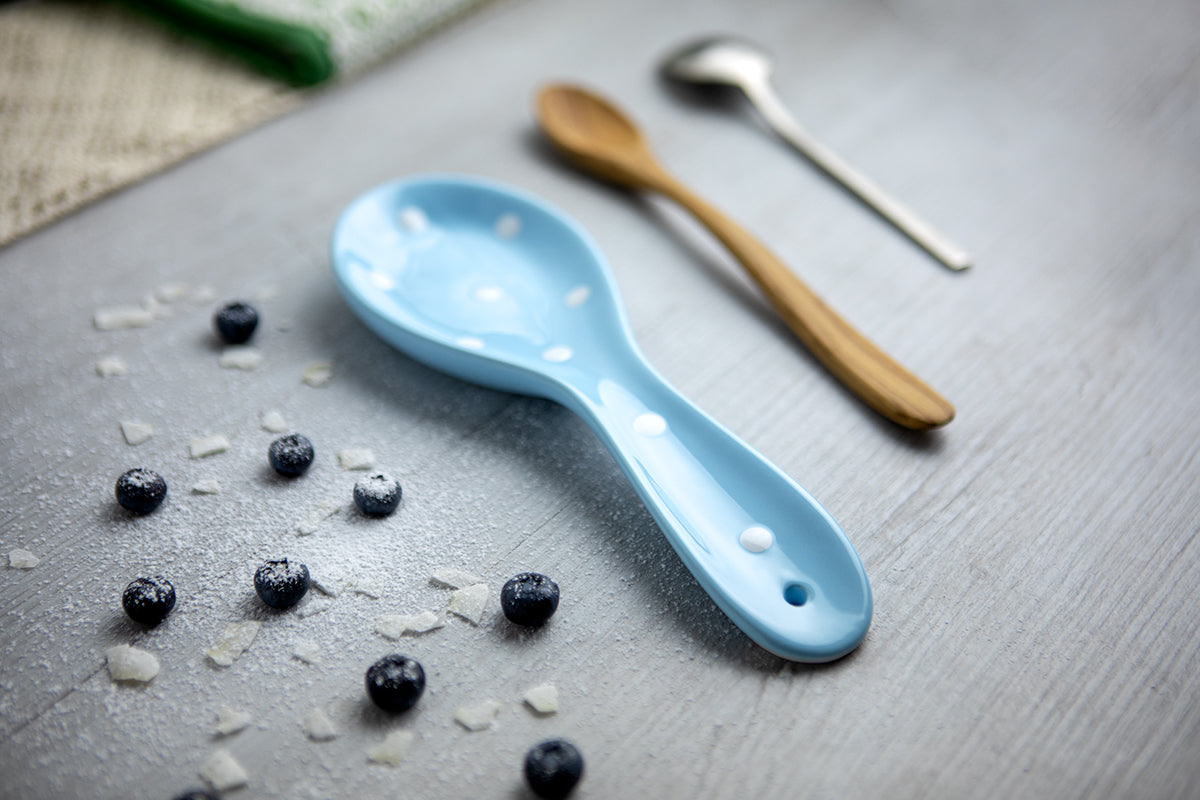 - 1 light sky blue and white polka dot spotty handmade hand painted ceramic pottery kitchen COOKING SPOON REST utensil holder.