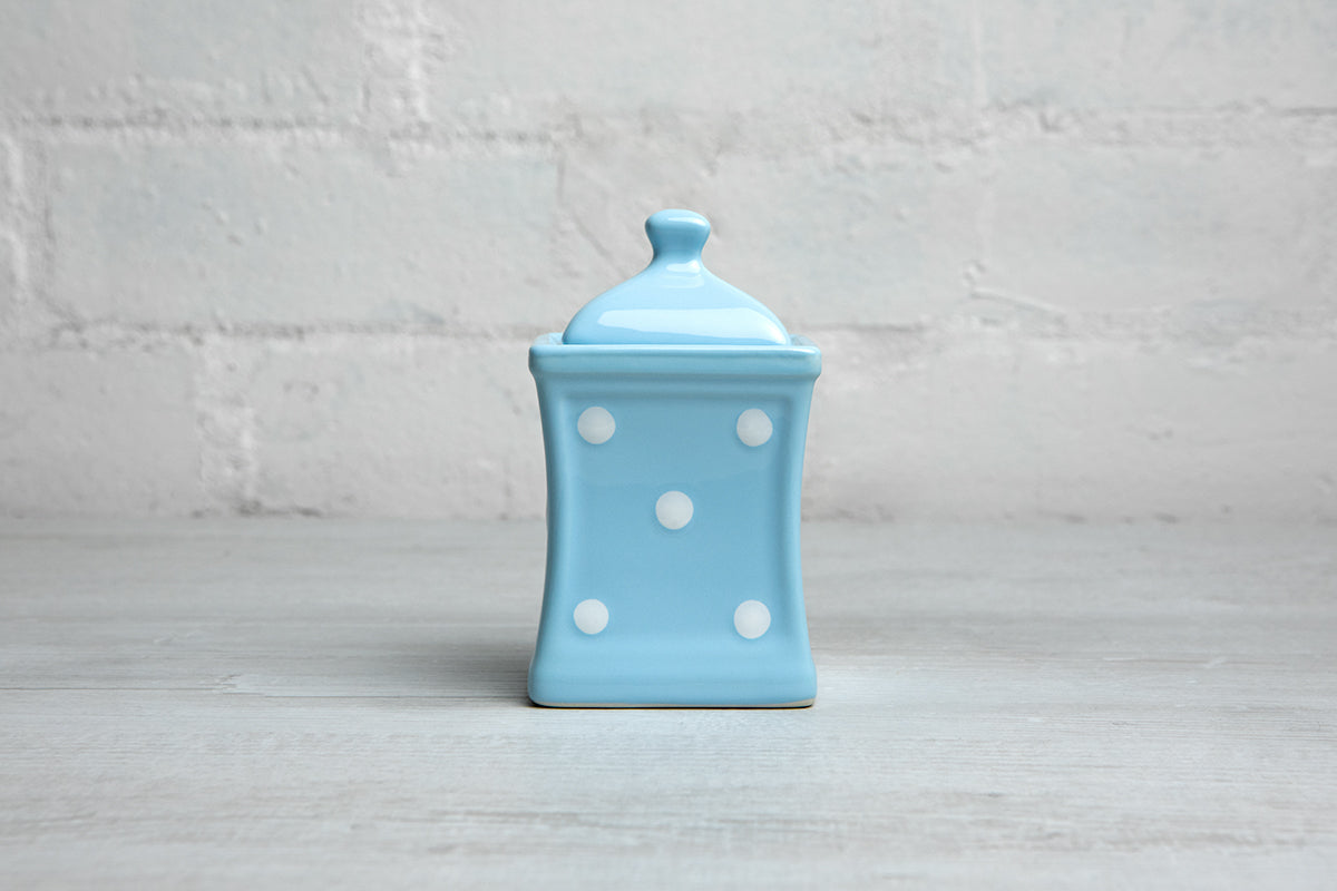 - We created this light sky blue and white polka dot handmade hand painted small ceramic kitchen herb spice storage jar with lid that feels luxurious yet wallet-friendly at the same time.