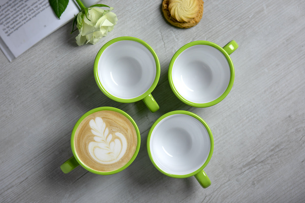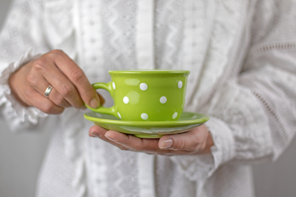 - We created this lime green and white polka dot spotty designer handmade hand painted ceramic cappuccino coffee tea cups with saucer that feel luxurious yet wallet-friendly at the same time.