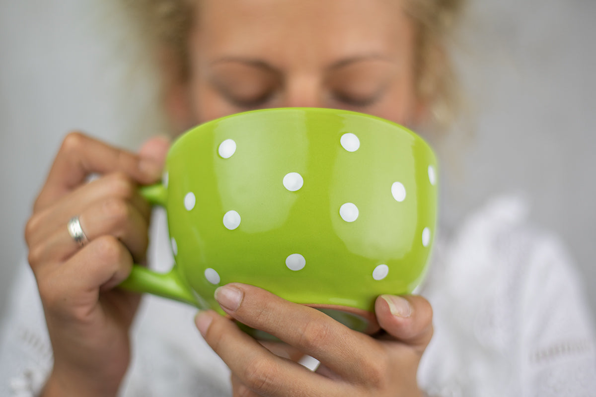 - Our lime green and white polka dot spotty handmade hand painted ceramic extra large cappuccino coffee tea soup mugs, cups are hand painted coffee mugs, but still dishwasher safe - less time washing up, more time having fun.