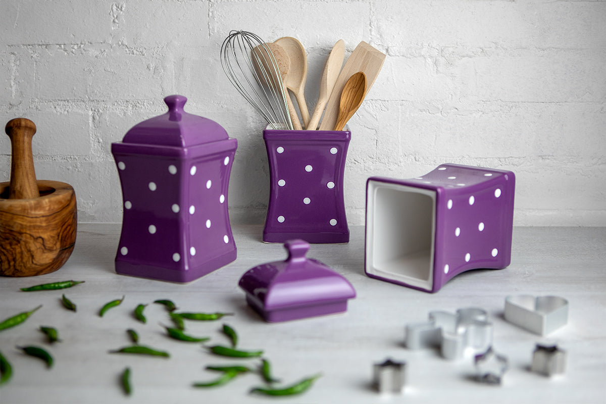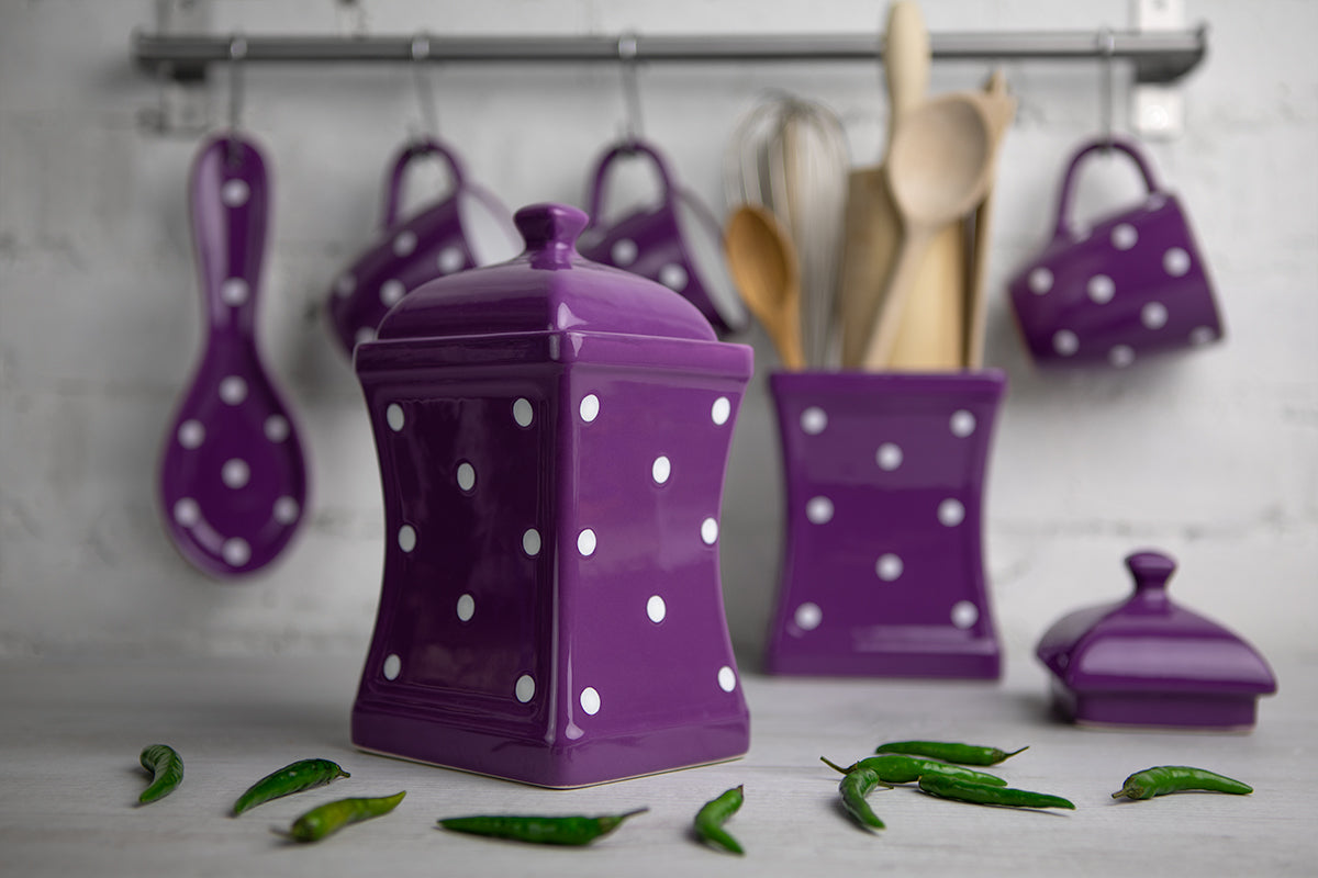 - Our purple and white polka dot pottery handmade hand painted large ceramic kitchen canister sets are made using solar power, so by choosing these purple and white polka dot spotty handmade hand painted ceramic kitchen kitchen accessories, you will help the environment, make your home eco-friendly and support sustainable living.