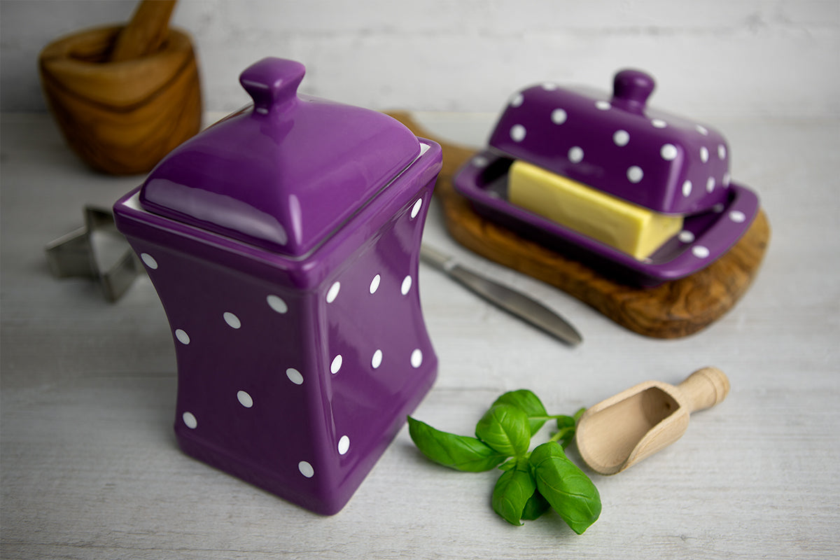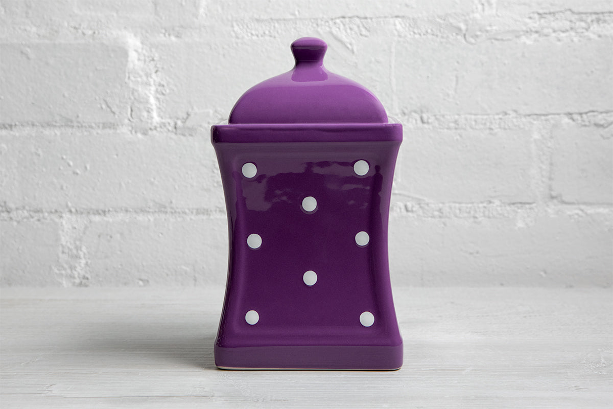 - We created this purple and white polka dot pottery handmade hand painted large ceramic kitchen canister set that feels luxurious yet wallet-friendly at the same time.
