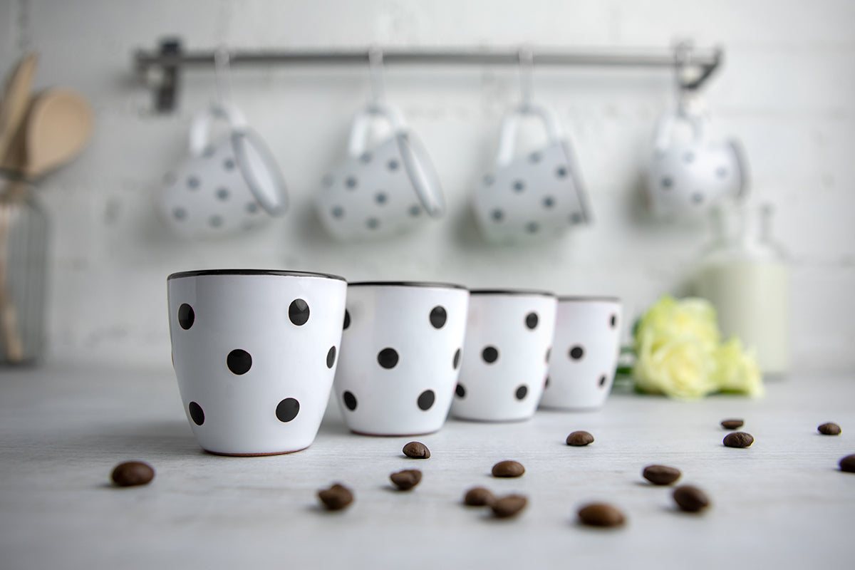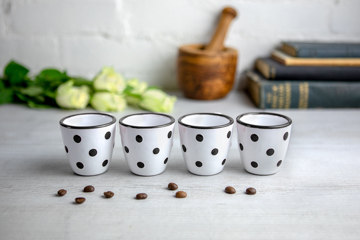 - We created this white and black polka dot spotty designer handmade hand painted unique ceramic espresso coffee cups set of 4 that feel luxurious yet wallet-friendly at the same time.