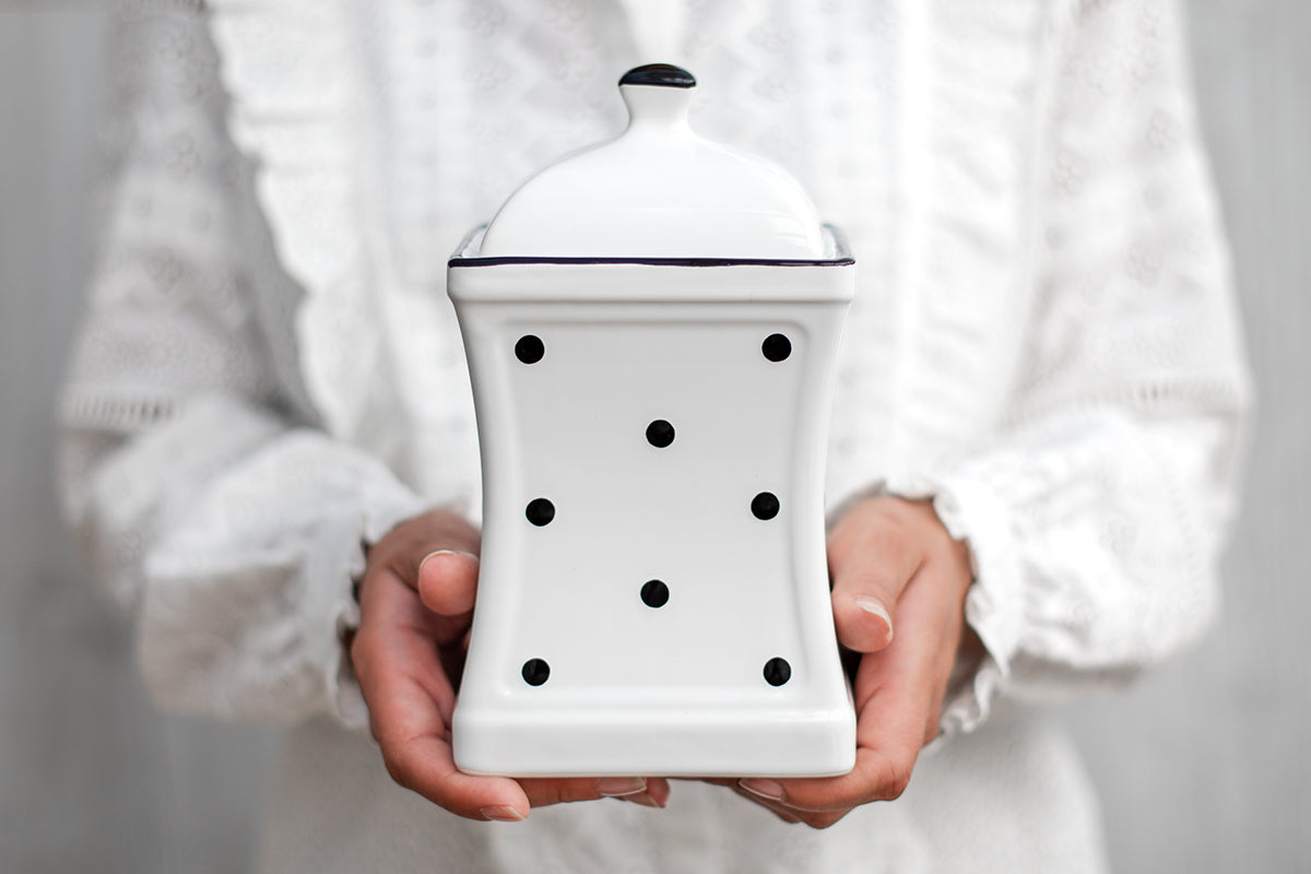 Give your kitchen a touch of cottage charm with this practical and unique white and black polka dot spotty handmade hand painted ceramic kitchen serving storage set. Since the cottage colour palette is light and airy, it is hard to go wrong with crisp, classic white paired with soft lime, as this white and black polka dot spotty handmade hand painted ceramic kitchen serving storage set will look fresh and appropriate even in the busiest kitchens. This laid back ceramic kitchen set includes:
