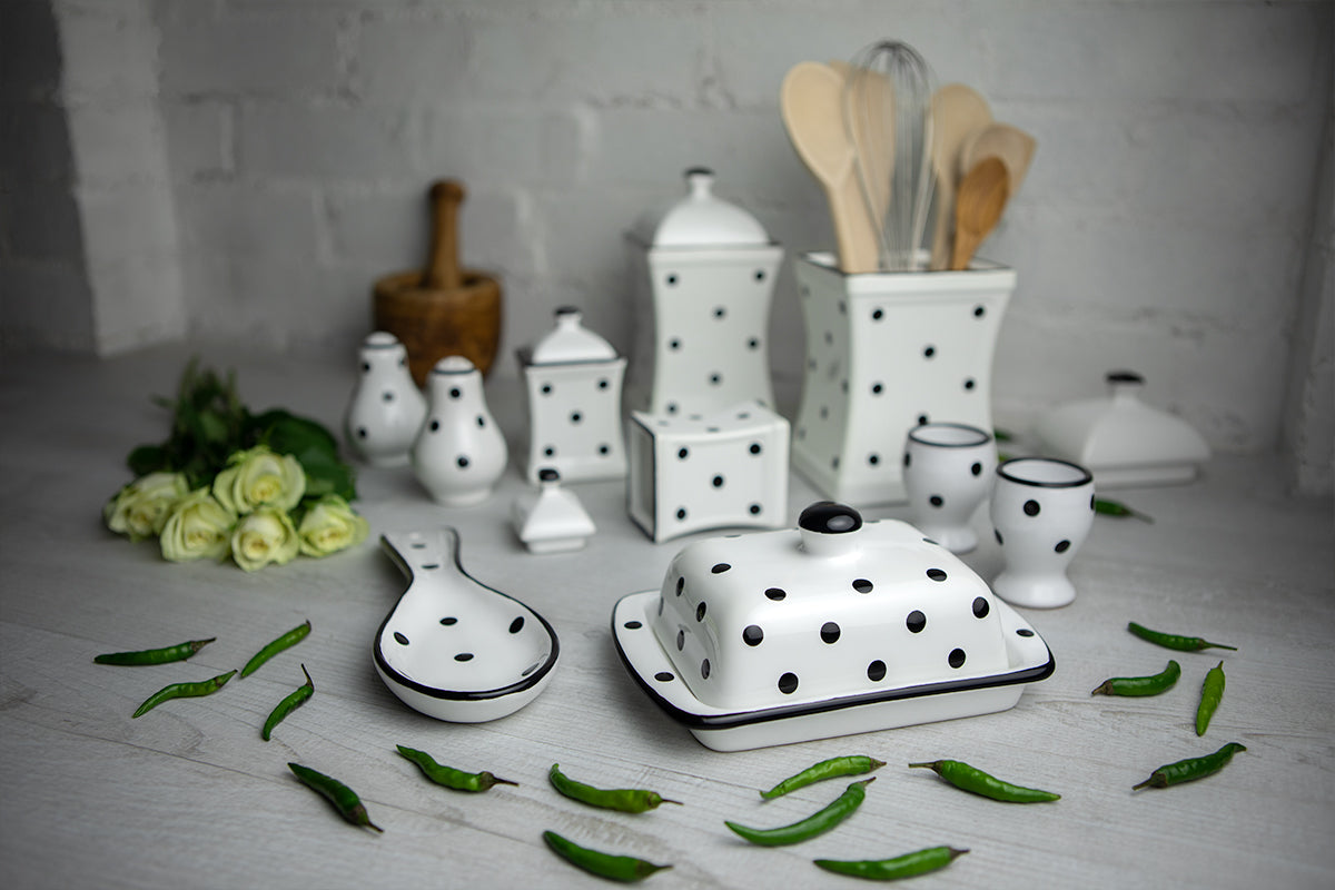 - Our white and black polka dot spotty handmade hand painted ceramic kitchen serving storage set are hand painted kitchenware sets, but still dishwasher safe - less time washing up, more time having fun.