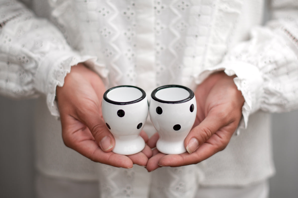 - 1 white and black polka dot spotty handmade EGG CUP holder SET of 2.