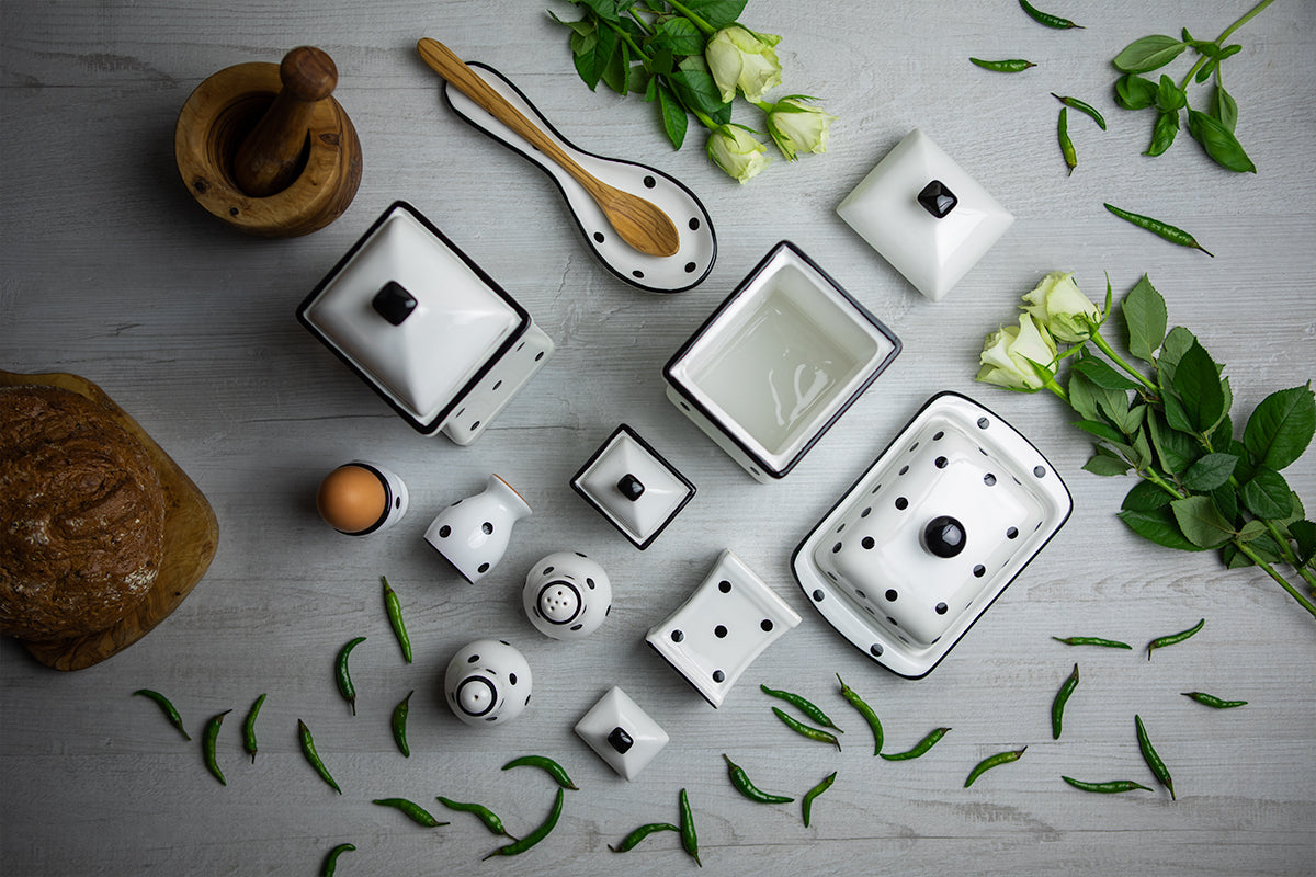 - Our white and black polka dot spotty handmade hand painted ceramic kitchen serving storage sets are made using solar power, so by choosing these ceramic eco kitchenware sets, you will help the environment, make your home eco-friendly and support sustainable living.